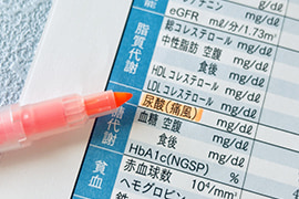 血液中の善玉コレステロール(HDL)と悪玉コレステロール(LDL)の量を測り、その結果で動脈硬化のリスクを判定します。善玉コレステロールは、動脈硬化を防ぐ働きがあり量が少ない場合は動脈硬化のリスクが高まります。また、悪玉コレステロールは動脈硬化を進行させる働きがあり、量が多い場合は注意が必要です。善玉・悪玉コレステロールについては単独の数値ではなくバランスが重要となりますので、指摘を受けた場合はお早めにご相談ください。生活習慣を見直し改善できると、病気のリスクを抑えることができます。
